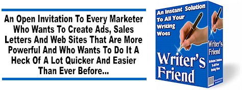 As you can see, Writer's Friend isn't a complicated piece of software you need a degree in computer engineering to use. In fact, it's about as easy-to-use as they come. And I bet that just by looking at the screen shot you already know how to use it. Now please let me explain a couple of things about the screen shot you may have been wondering about. You may have notice that some of the Headlines went past the edge. Not to worry. When you click on them they automatically appear in the smaller box at the bottom - the box which only contains the words... "Lost For Words? Push The Buttons And Voila!" Which is exactly what Writer's Friend enables you to do. If you want to add that text to your sales letter, ad, web page, book or whatever, you simply highlight the text in the bottom box, copy it and then paste it wherever you want it to be. And you do it all, with A Click Of The Mouse!!! NO TYPING. EASY! EVERYTHING you need to QUICKLY and EASILY make your copy MORE POWERFUL, so it gets you the results you WANT, is right AT YOUR FINGER TIPS - a mouse click away. The ONLY time you need to go to the Menu system is if you want to check out the "About" box. All the help you need is a single click away. And if you'd rather go over the help file on paper, you can print it out using the button at the bottom of the help file window (EASY)! There's also ample on-screen help so you can't go wrong. Merely hover your mouse over a button or box or tab and help pops up automatically for you. As you can see, Writer's Friend is EASY-TO-USE and takes all the hard work OUT of all your writing tasks. And because everything you need is just a mouse click away, NOTHING could be EASIER! This is one software tool NO PERSON WHO WRITES SHOULD BE WITHOUT!!! It makes writing such a breeze. Okay. By now you must be wondering what the investment required is to get hold of this must-have marketer's tool. Well, before I reveal the price I want you to think about something... Think about HOW MUCH it's WORTH to you. Think about HOW MUCH it's WORTH to be able to CUT BACK on your writing time. Think about HOW MUCH it's WORTH to be FREE OF THE HEADACHES of brain-fog, writer's block and words that won't come no matter how hard you try. Think about HOW MUCH it's WORTH to be able to WRITE WITH MORE POWER and have your copy literally JUMP OFF THE PAGE. Think about HOW MUCH it's WORTH to have copy that gets BETTER RESULTS. Think about it. It's WORTH A LOT to you, isn't it? And certainly WORTH FAR MORE than the measly $97 being asked. In fact, when you think about HOW MUCH it's WORTH to you in terms of the amount of time and effort saved and the increased sales you get because your ads, letters and web pages are more effective, and when you think about HOW MUCH all of that's WORTH to you EACH and EVERY DAY for as long as you have ads, letters and web pages, $97 is chicken feed. Look. If you're sincere about wanting to be able to WRITE QUICKER, EASIER AND WITH MORE POWER than ever before, and if you're sincere about wanting your copy to be COPY THAT GETS READ AND ACTED ON, then investing $97 for Writer's Friend is the best darn investment you could ever make. Really! Of course, your INVESTMENT is TOTALLY PROTECTED thanks to the 365 Day 100% Money-Back Guarantee! Put Writer's Friend to work for you for a full twelve months. If after that time you haven't found it quicker and easier to create copy that packs more of a punch, then simply ask for your money back. You'll get a no-hassle refund on the spot - no questions asked. That's a promise! Am I insane to offer such a guarantee? Maybe. The truth is... once you have Writer's Friend you'll see how much quicker and easier it is to write and you'll see how much more powerful your copy has become, and you won't want your money back. And with the guarantee you have NO RISK WHATSOEVER!!! In fact, you can ONLY COME OUT IN FRONT. And as if getting this POWERFUL ALLY and a 365 Day 100% Money-Back Guarantee wasn't enough, you also get... Twelve Months Support, For FREE! While other software vendors want to charge you for support all the time, you get it from me for FREE when you respond to this offer within 48 hours! ORDER RIGHT NOW by clicking here. Listen. If you're serious about wanting an easier and quicker way to create copy that's more powerful, gets read and acted upon, then you owe it to yourself to get this software and DO IT NOW!!! Don't put it off for one second. Don't dilly-dally about it. Don't um and ah. You know you want to be able to write quicker and easier. You know you want to write with more power. You know you want your copy to produce better results. You know Writer's Friend gives you everything you want, saves you loads of time and effort and is WORTH a tremendous amount to you. Start enjoying the ease and speed at which you pump out powerful copy. Order right now while it's fresh in your mind. Click here. The more you think about it, the more you want to get Writer's Friend because you can see how much it's WORTH to you, how much better off your copy will be and because it comes with a 365 day 100% money-back guarantee which means you have ZERO RISK! So go grab you credit card and order right now this very second. You'll be glad you did. Thanks for reading and look forward to your order. Yours for Quicker, Easier And More Powerful Writing, Collin Almeida Success Strategies Inc P.S. Writer's Friend, which helps you write quicker, easier and with more power than ever before, will run on any IBM compatible computer running Win95 or greater and comes with a 365 day 100% money-back guarantee. And is a 2.3 megabyte download. P.P.S. Whether